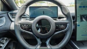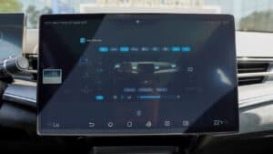 Trung tâm bảng điều khiển là màn hình cảm ứng thông tin giải trí kích thước lớn 15,6 inch, hỗ trợ Apple CarPlay và Android Auto. Điểm đặc biệt của màn hình này là khả năng xoay ngang hoặc dọc linh hoạt, giúp người dùng dễ dàng tùy chỉnh theo nhu cầu sử dụng. Hầu hết các tác vụ cơ bản như điều chỉnh điều hòa, hướng gió hay các cài đặt khác đều được thực hiện thông qua màn hình này, mang đến trải nghiệm công nghệ hiện đại và tối giản.